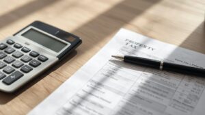 Gros plan sur une calculatrice, avis de taxe foncière et stylo sur un bureau en bois clair, ambiance bureau à domicile, lumière naturelle, style photo lifestyle immobilier
